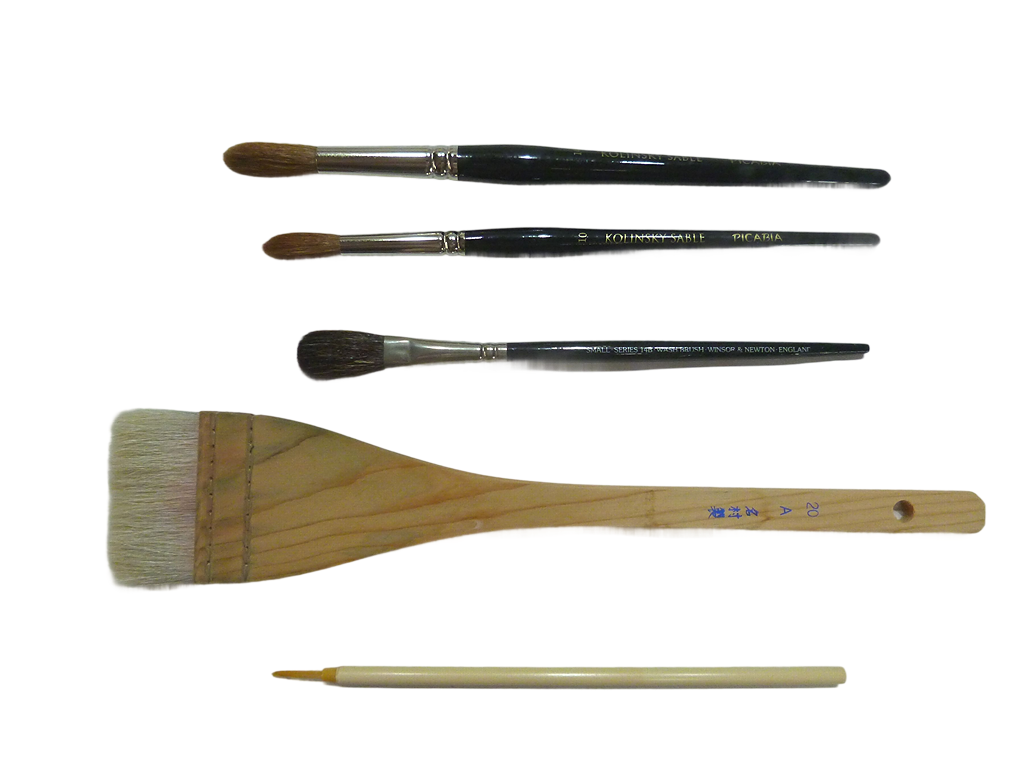 上からピカビア筆、ニュートンのseries14Bと呼ばれる平筆、広い面を塗る際の名村製刷毛、面相筆