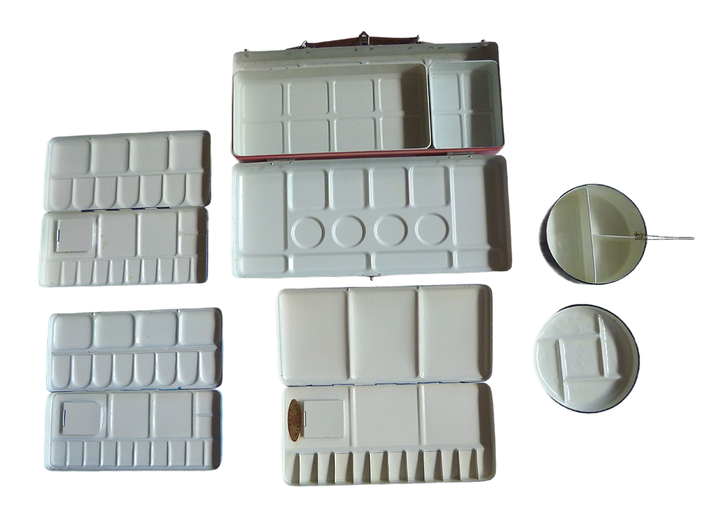 一番右の丸型パレットは何と本体が筆洗、ふたの部分がパレットとなっておりさらに筆置きの真鍮金具がついていました。なかなかいいアイデアですね。これはかなり状態が悪いのを入手したのですが、プラモデル用の塗料で修復を試みました。その悪戦苦闘については、後日記事にいたしますね。(笑)