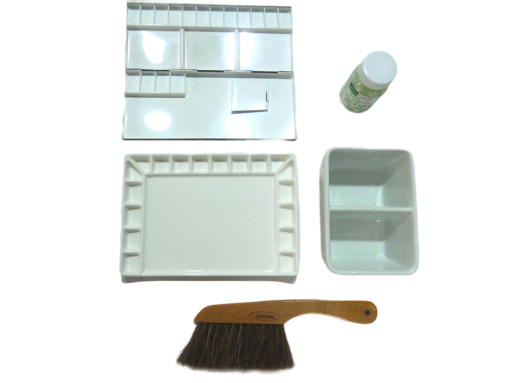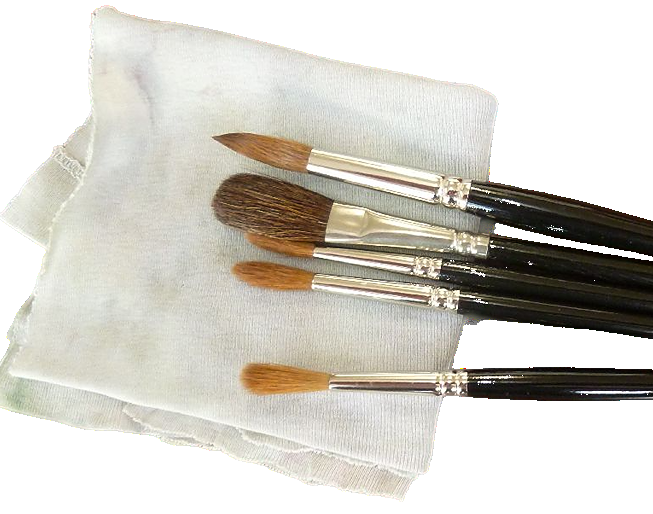 筆の先にガーゼのような布があるのがお分かりでしょうか。実は、この布(綿布)とても制作に大切なのです。筆先の水分をさっと拭き取ったり、色のトーンを下げたりするのに活躍してくれます。是非、気に入った布切れを用意されることをおすすめいたします。この布は古い肌着の部分で40年近く使っています。「ピーナッツ」という漫画に登場するキャラクターのライナスのように手放せません。(笑)