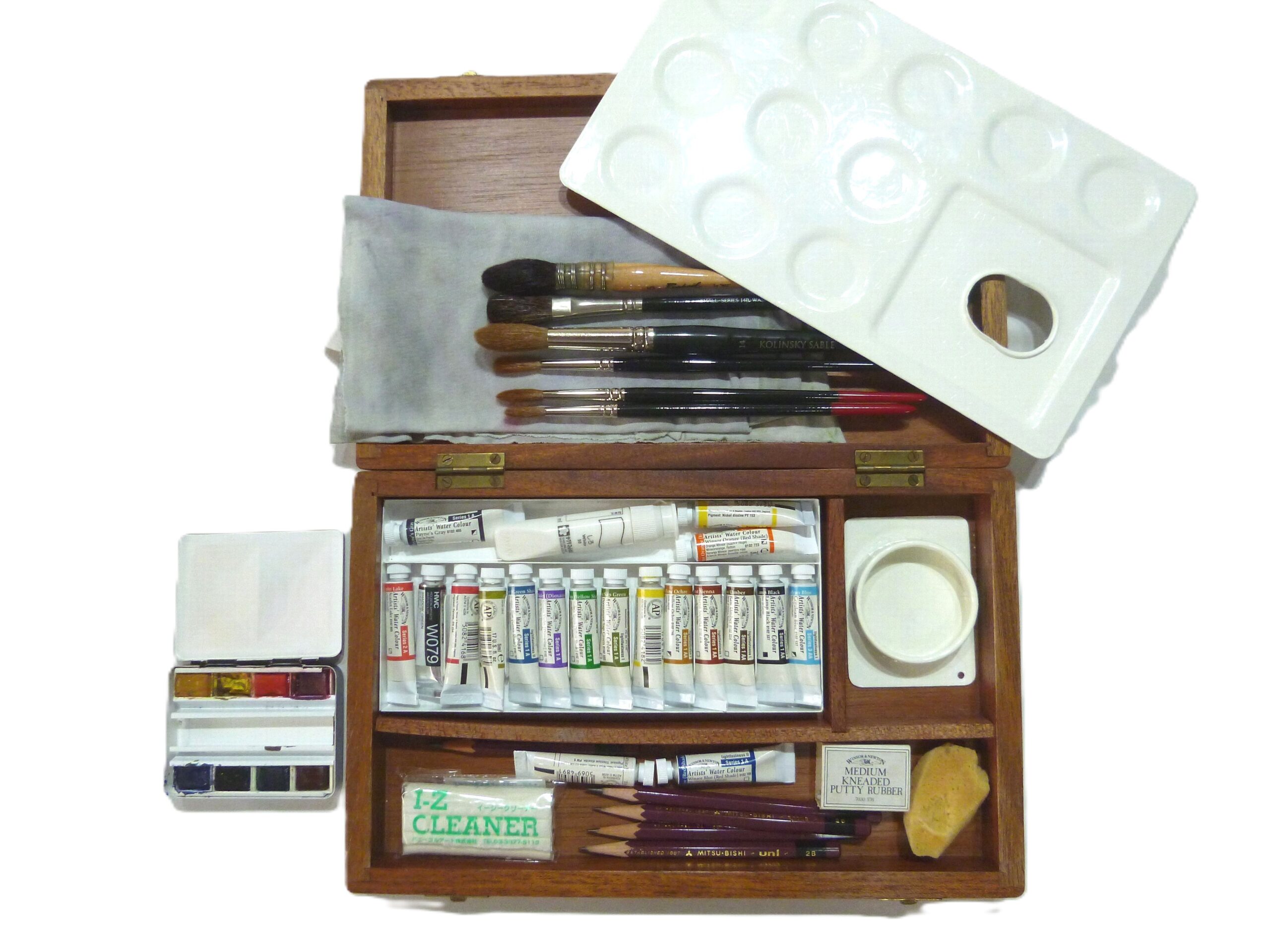 スケッチ箱(画箱)は、30年以上前大阪の老舗の画材店で購入したWinsor&Newtonのセットです。当時2万円程度でした。チューブ入絵具14色入りでパレット、筆洗、筆がセットになっていました。日本のものと違い、パレットは各色を入れる溝部分が円形の凹みとなっています。また、筆洗は小さい丸型ですので、筆が充分洗えるのかな?と少々不安でした。筆洗は別に用意した方がいいですね。