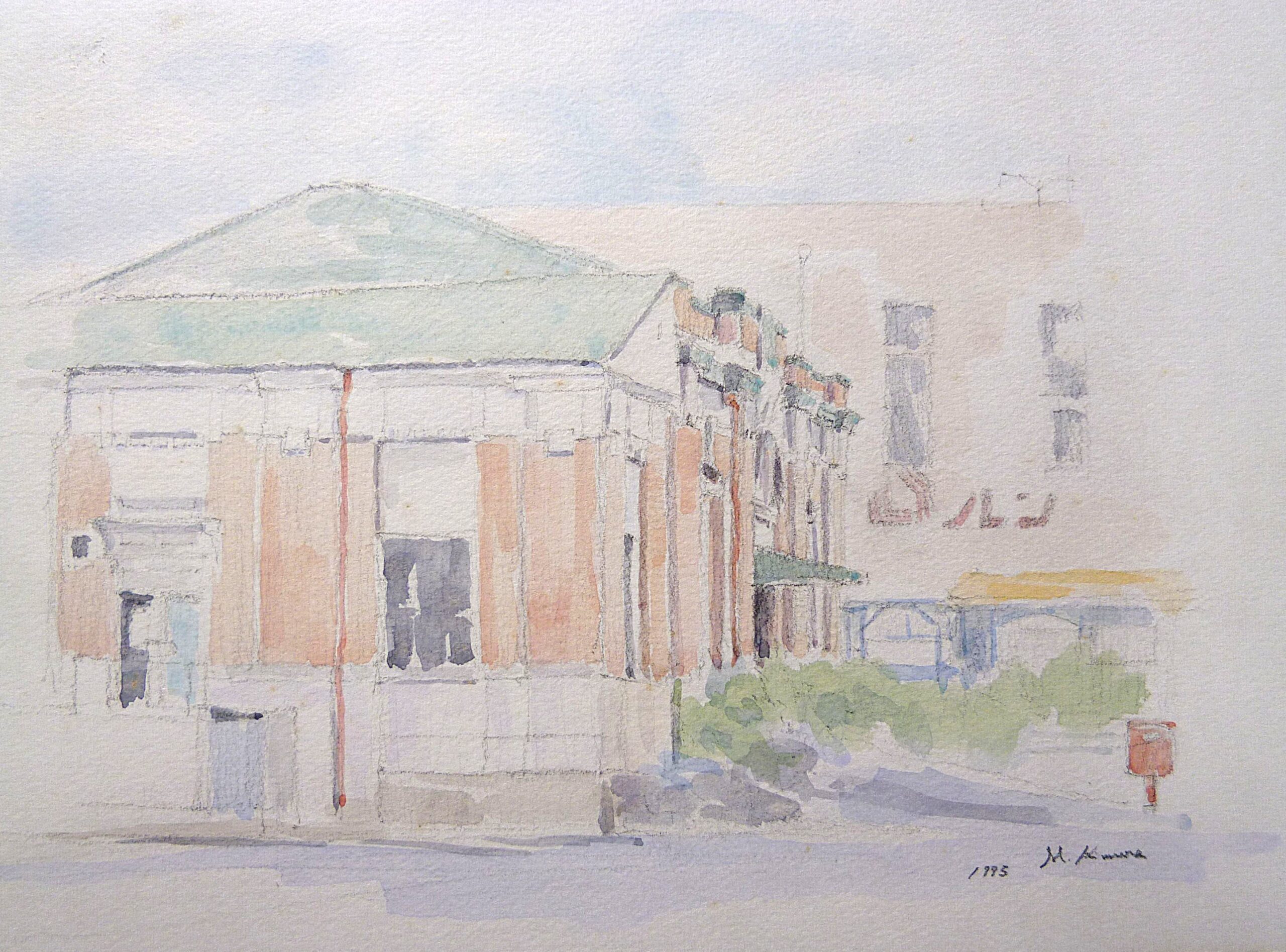 これは旧大阪電気軌道の変電所でしたが、昭和50年に改装され、陶芸や織物などを教えるクラフトスクールとして生まれ変わりました。現在は自然食のレストランになっているそうです。奈良国立博物館と比べると、正面の「顔」にあたる部分は凝っているとはいえややシンプルな造りとなっています。美しい煉瓦色の建物でした。もう少し描いておけばよかったと悔やまれます。