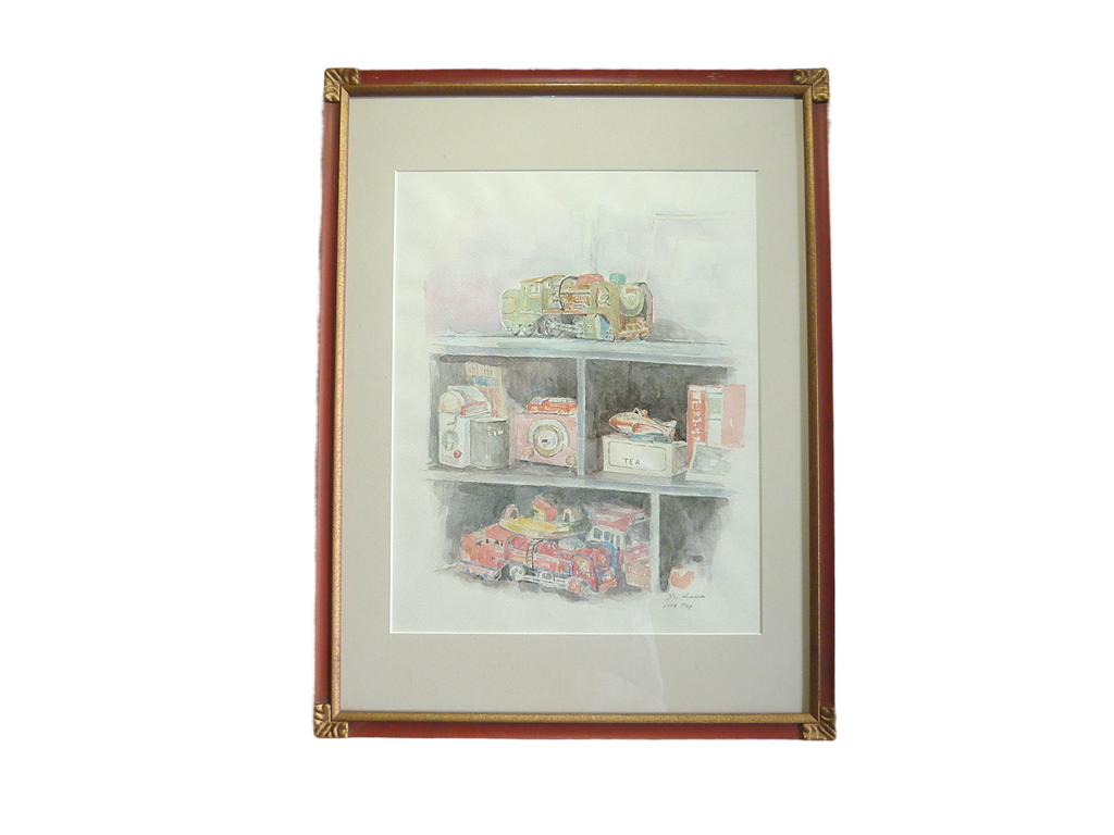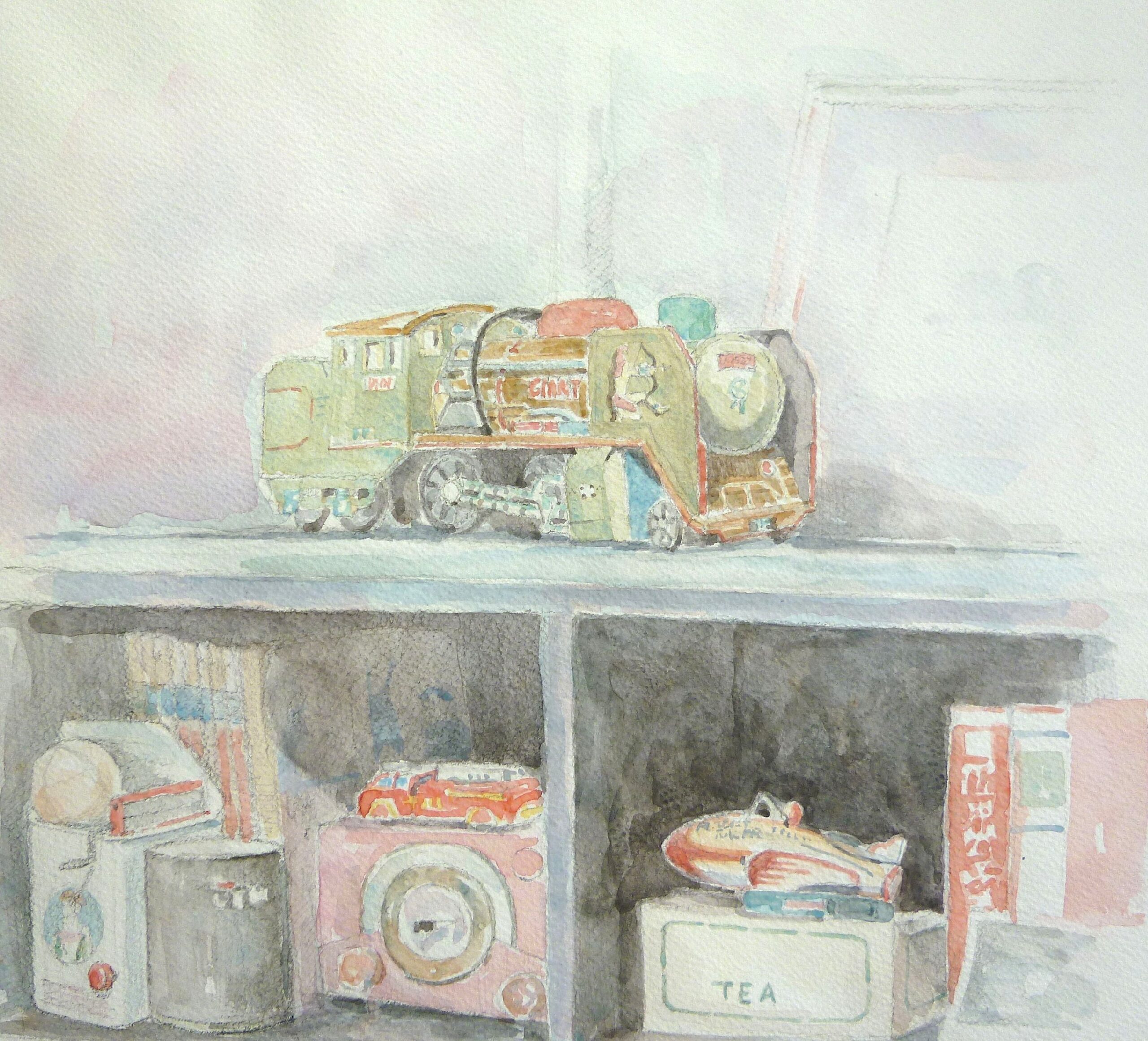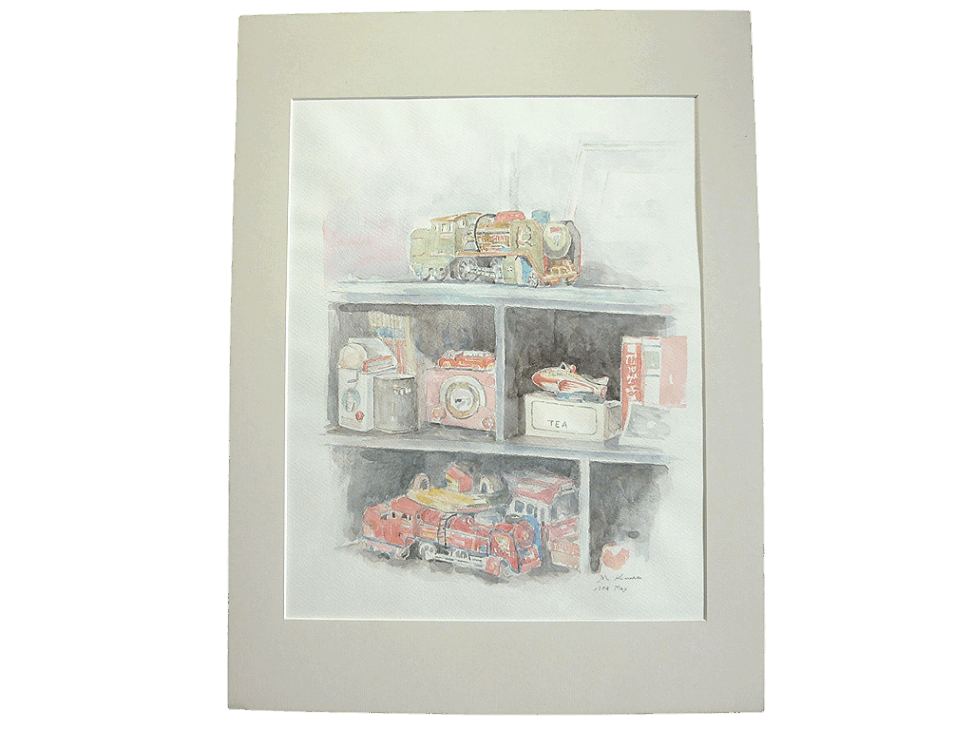 30年ほど前に描いた棚に並べたブリキのおもちゃです。大阪難波の個展に合わせて描いたものです。
