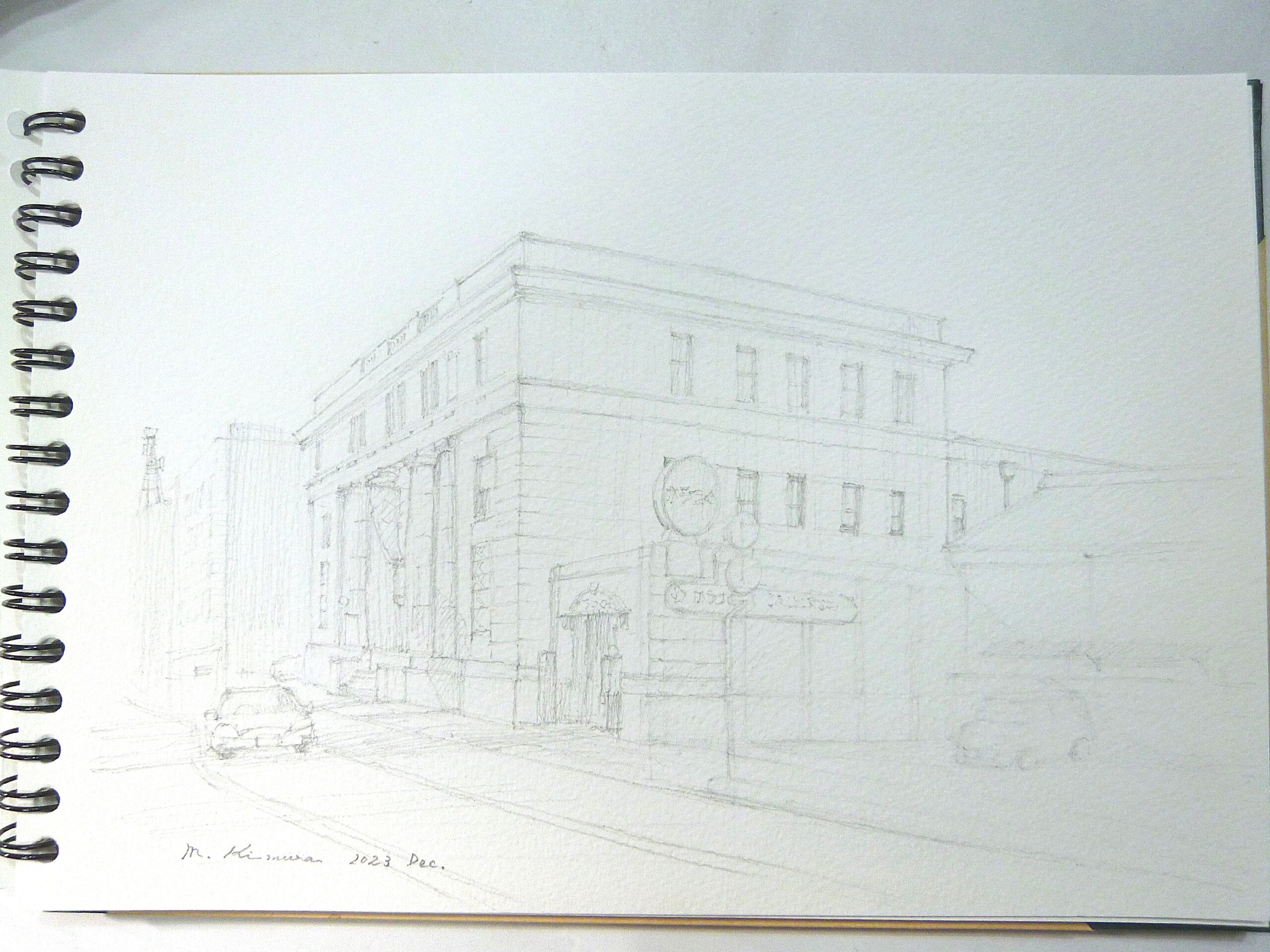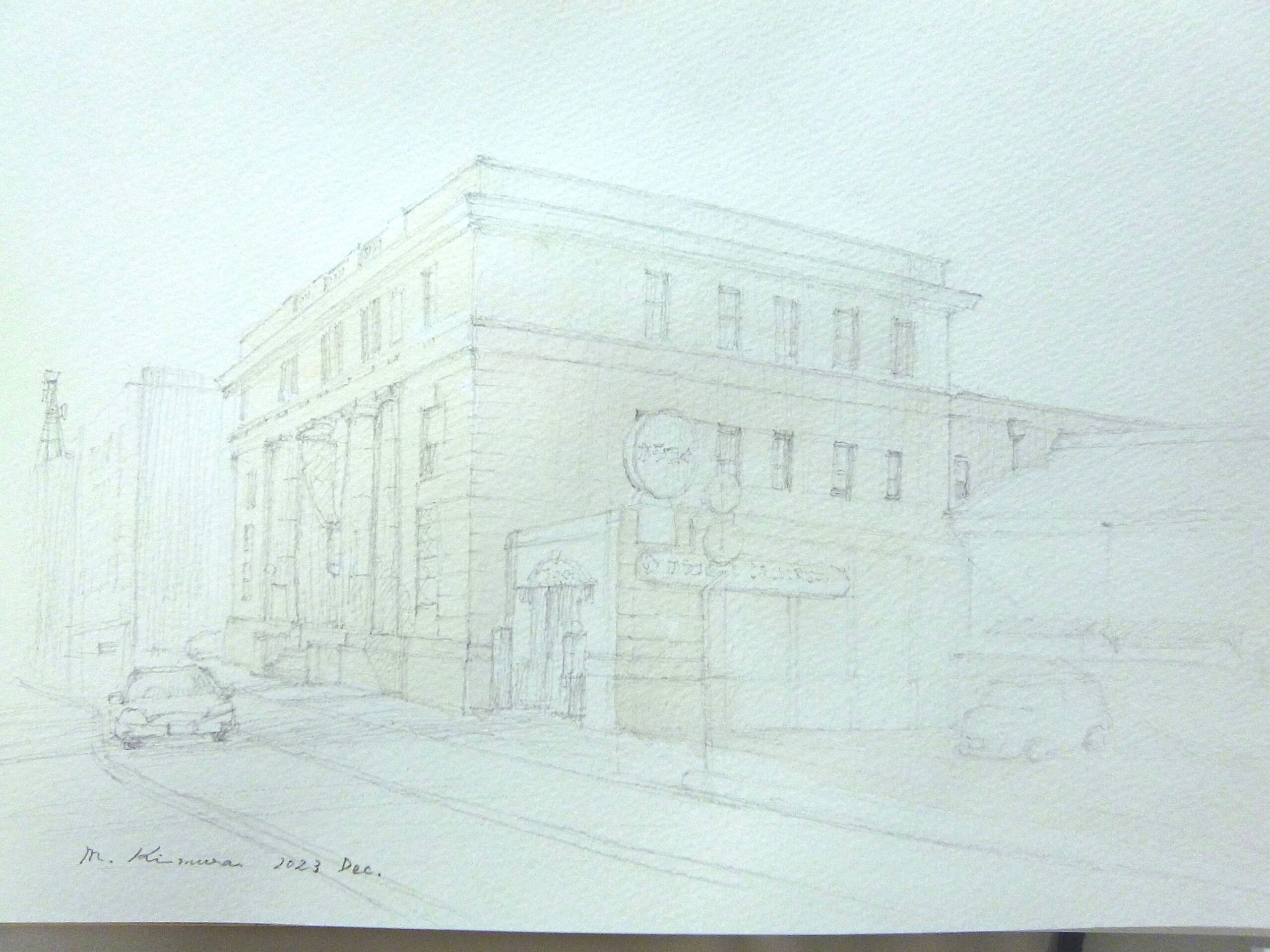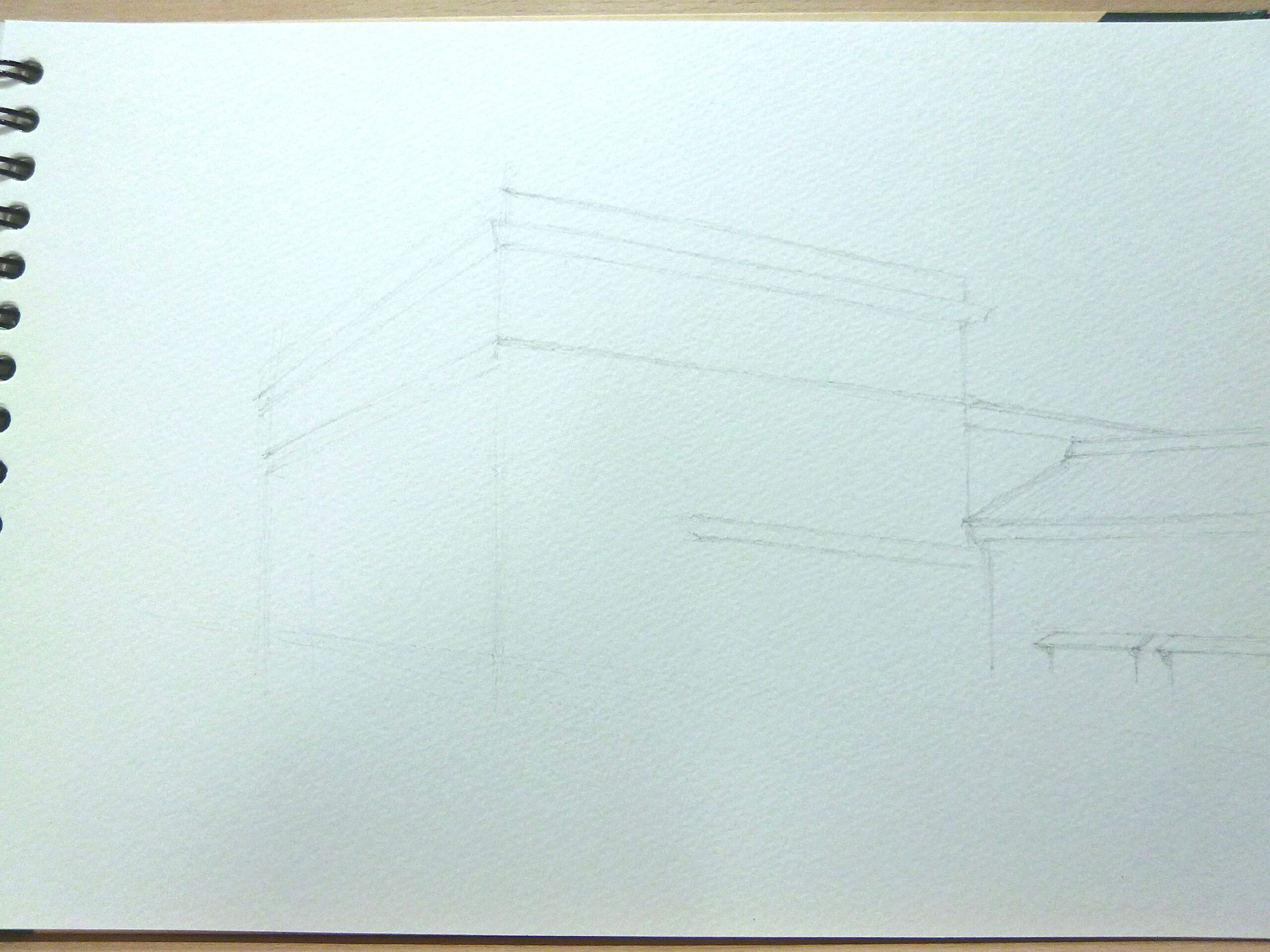 建物全体の骨格にあたるラインを慎重に定めていきます。二点透視図法ですが、消失点は画面外になります。