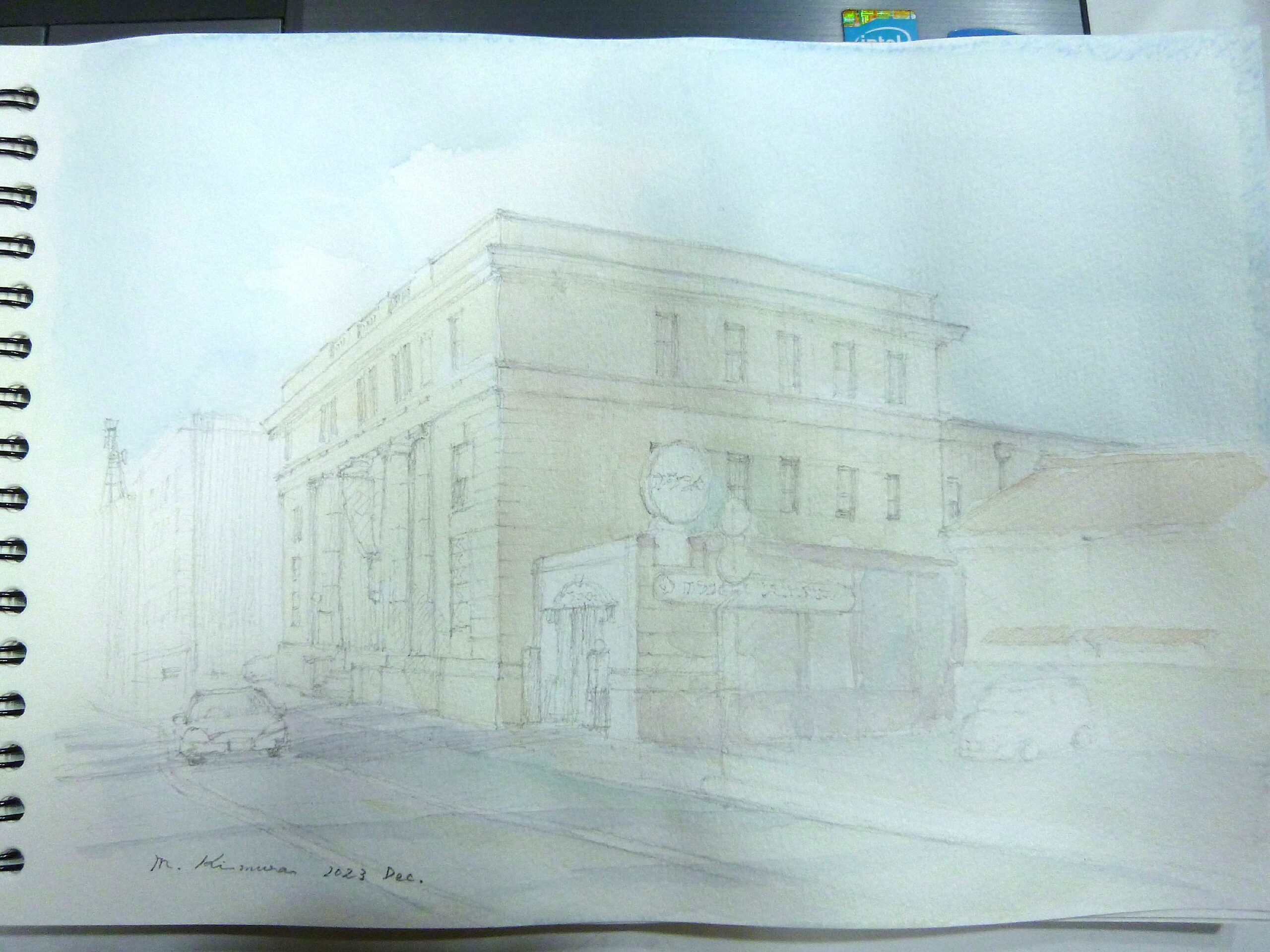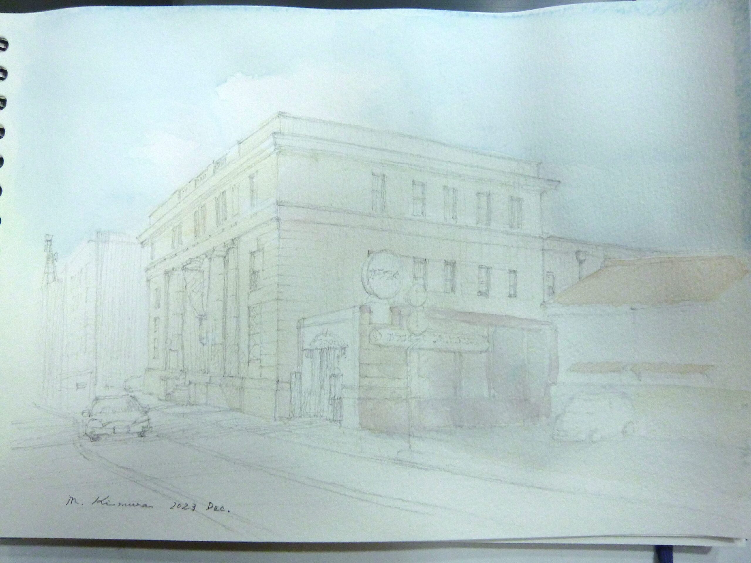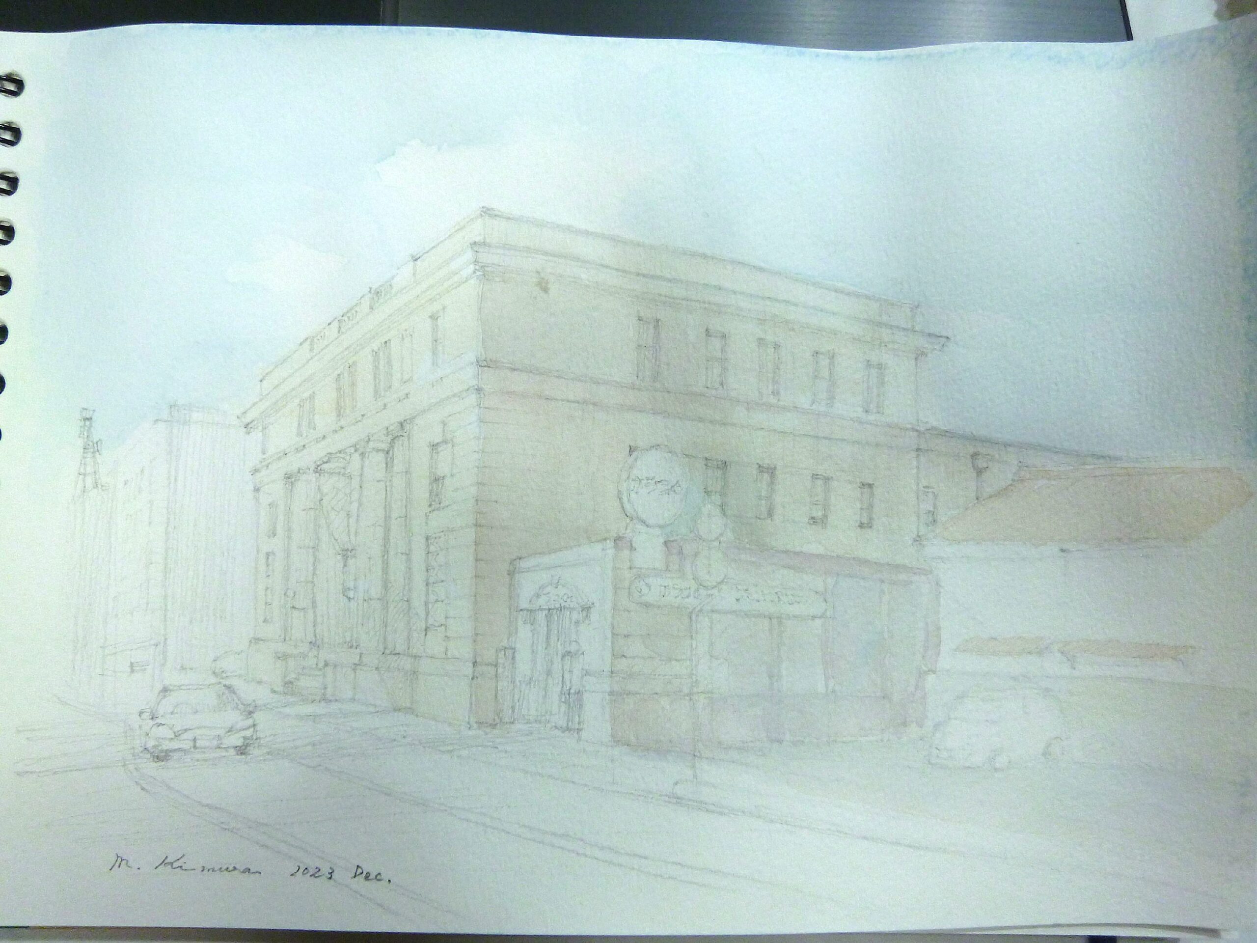 画面左のビルを描きこみます 右の民家の屋根を濃くしたりして完成へ