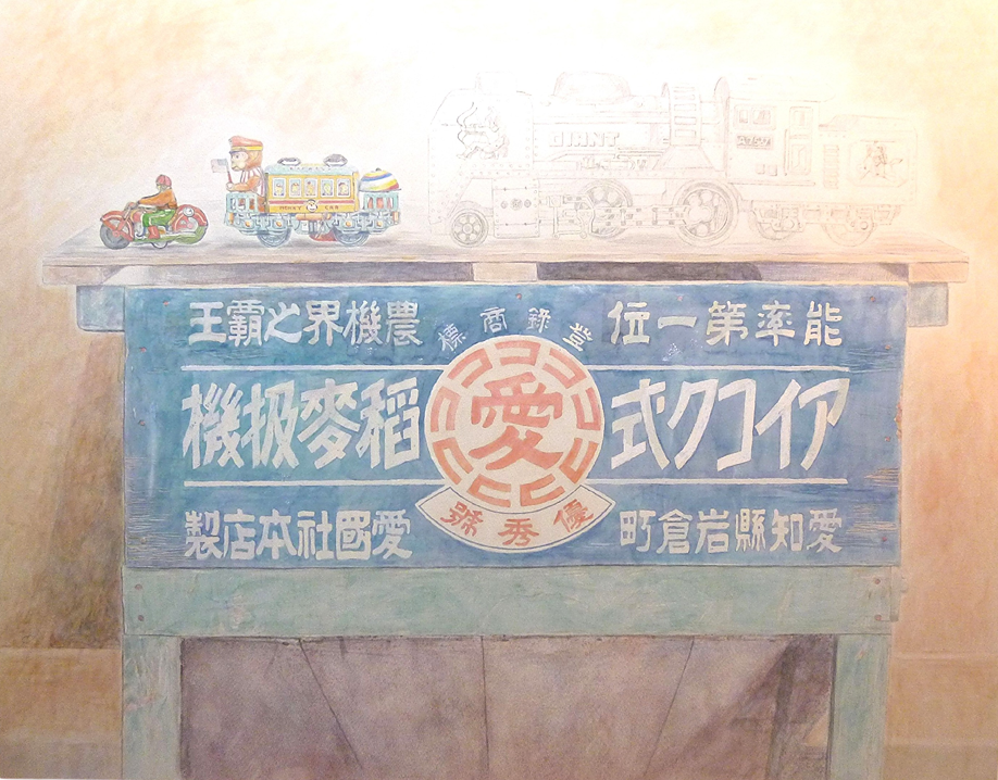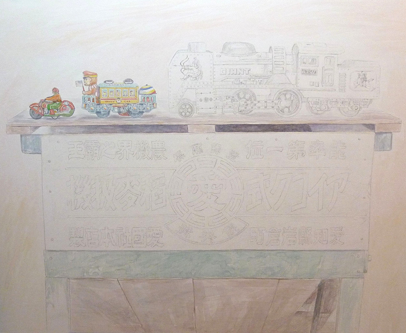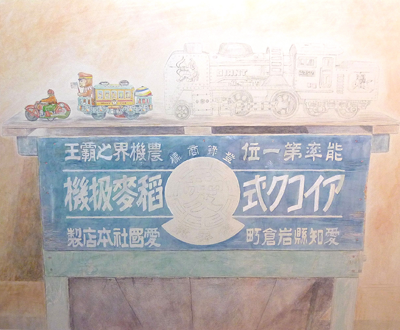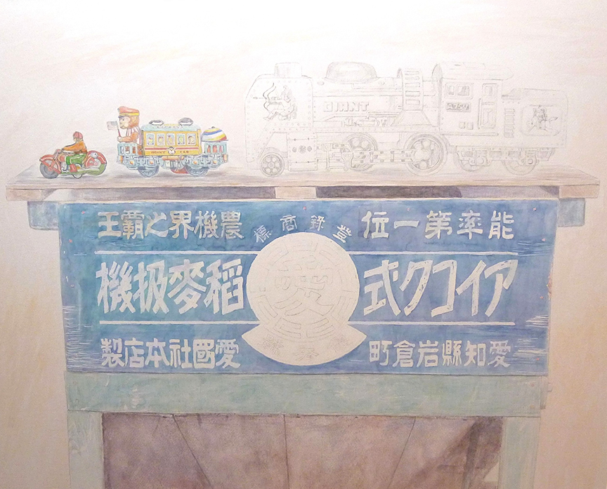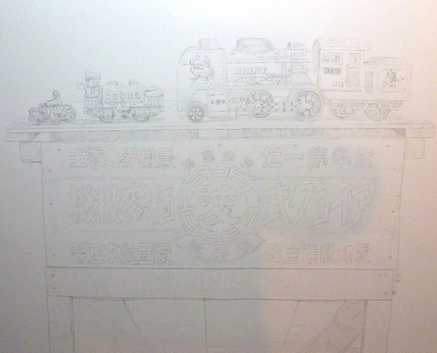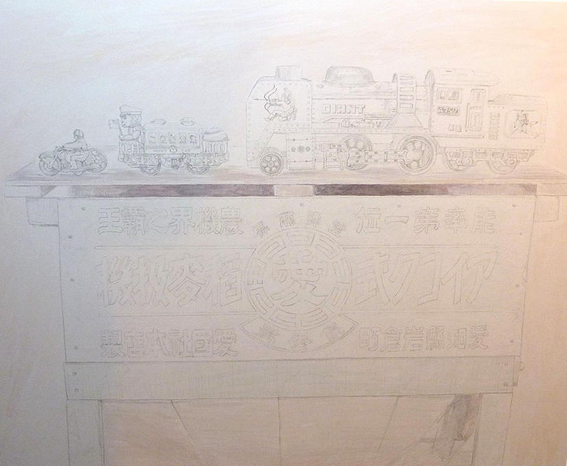 アクセントになる脱穀機の中心部の「愛」という文字を塗ります。