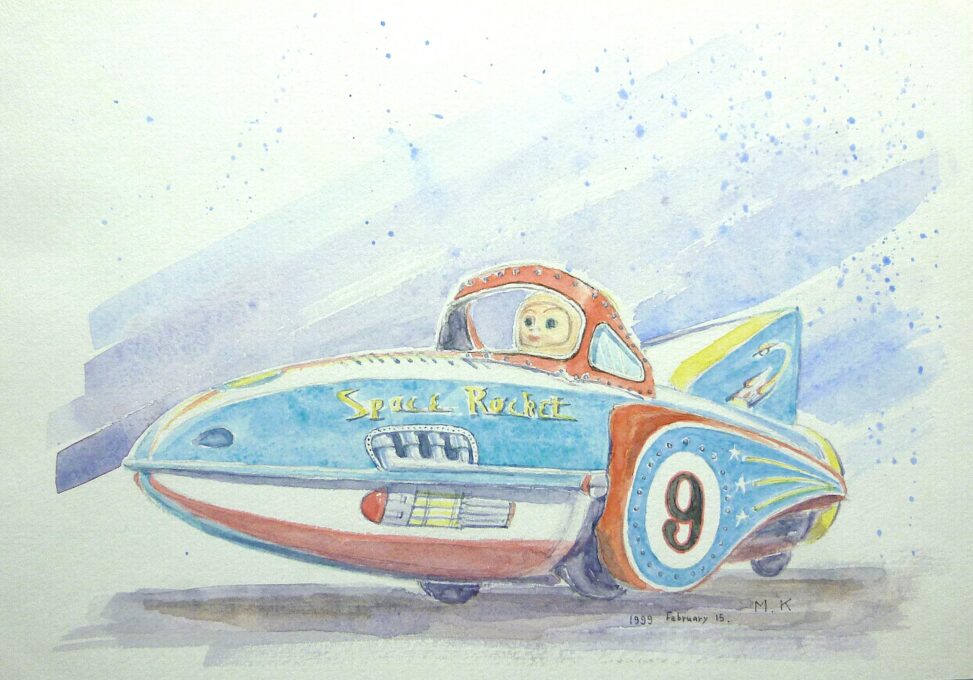 これもロケットレーサーなのですが、恐らく1960年代前半に作られたものでしょう。少年レーサーの顔はブリキではなく、ソフビのようです。顔が手塗りのため、個体によっては可愛くない顔?もあり。(これが結構重要でして、絵にするにはやはり可愛くないと…)また、箱付きは収集歴20年の私でも見たのは1体だけです。下は1999年の作品。 バックはスパッタリングで勢いを出してみました。