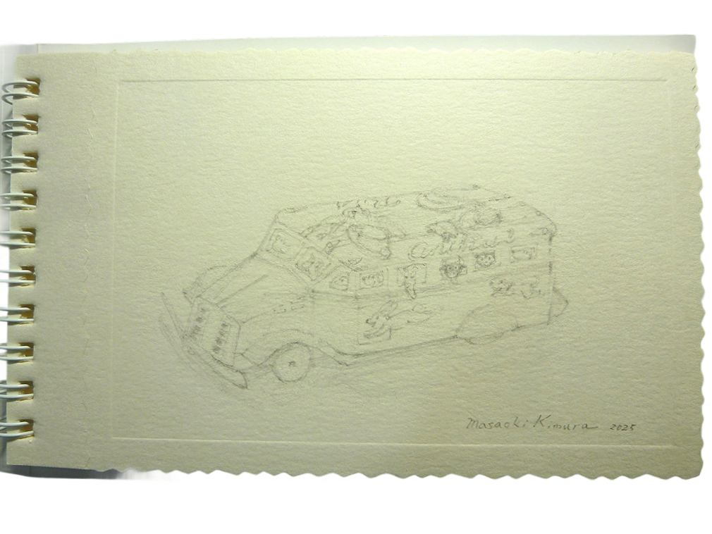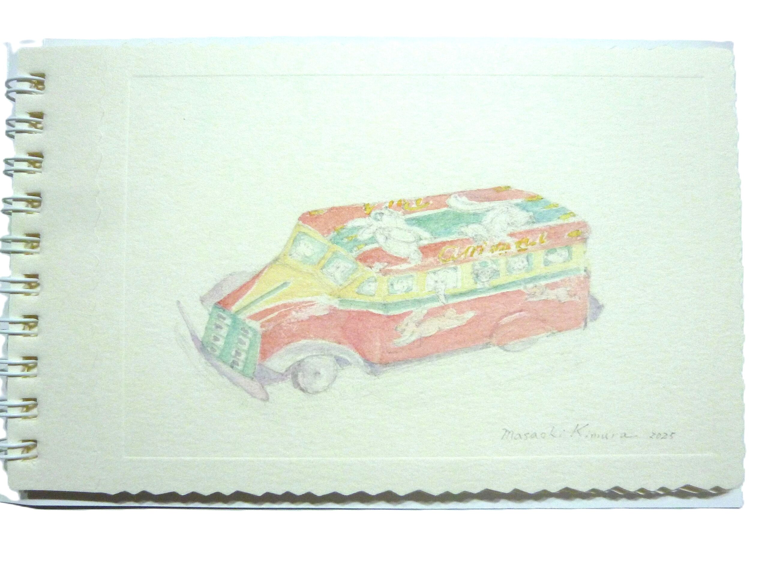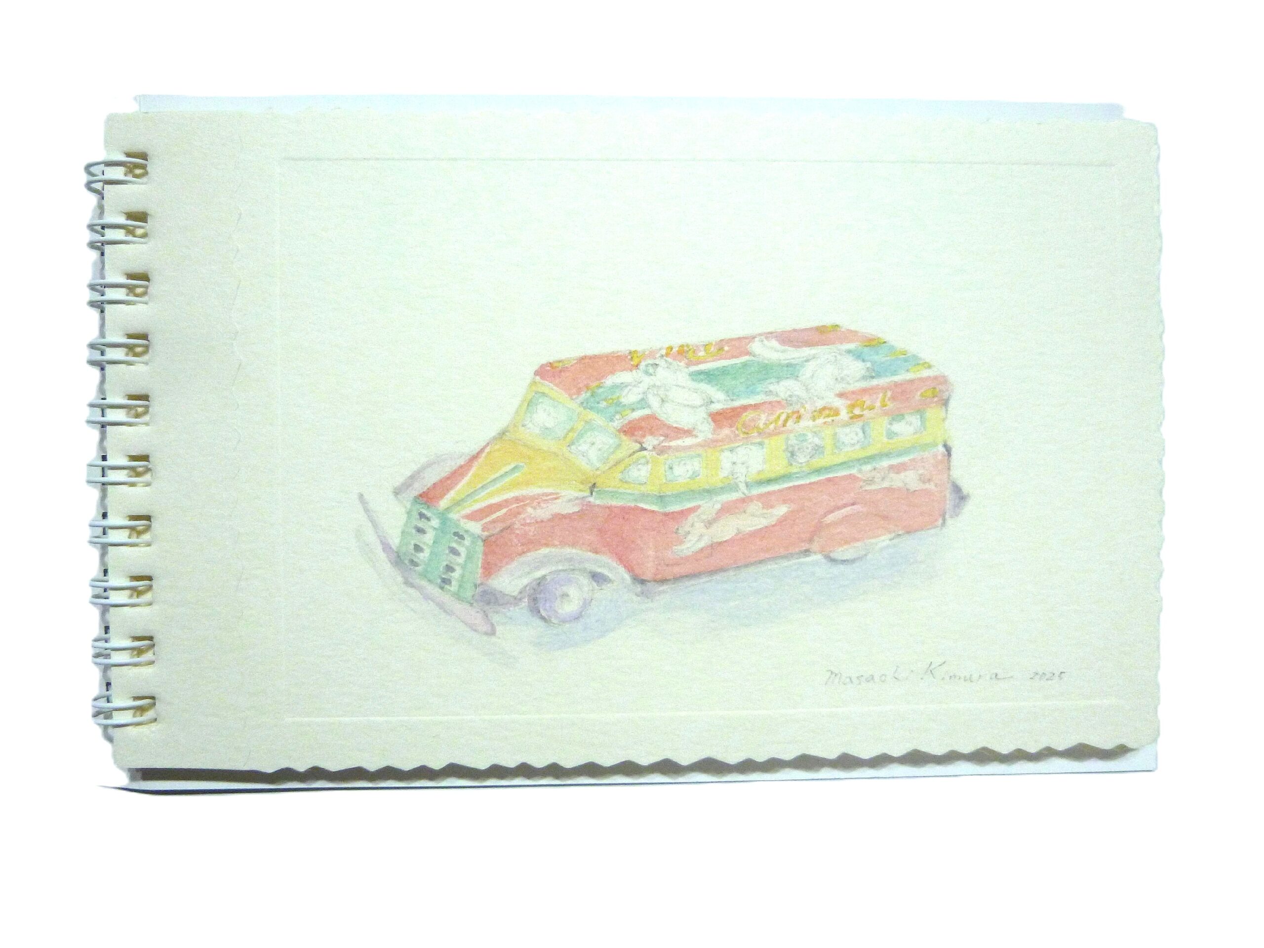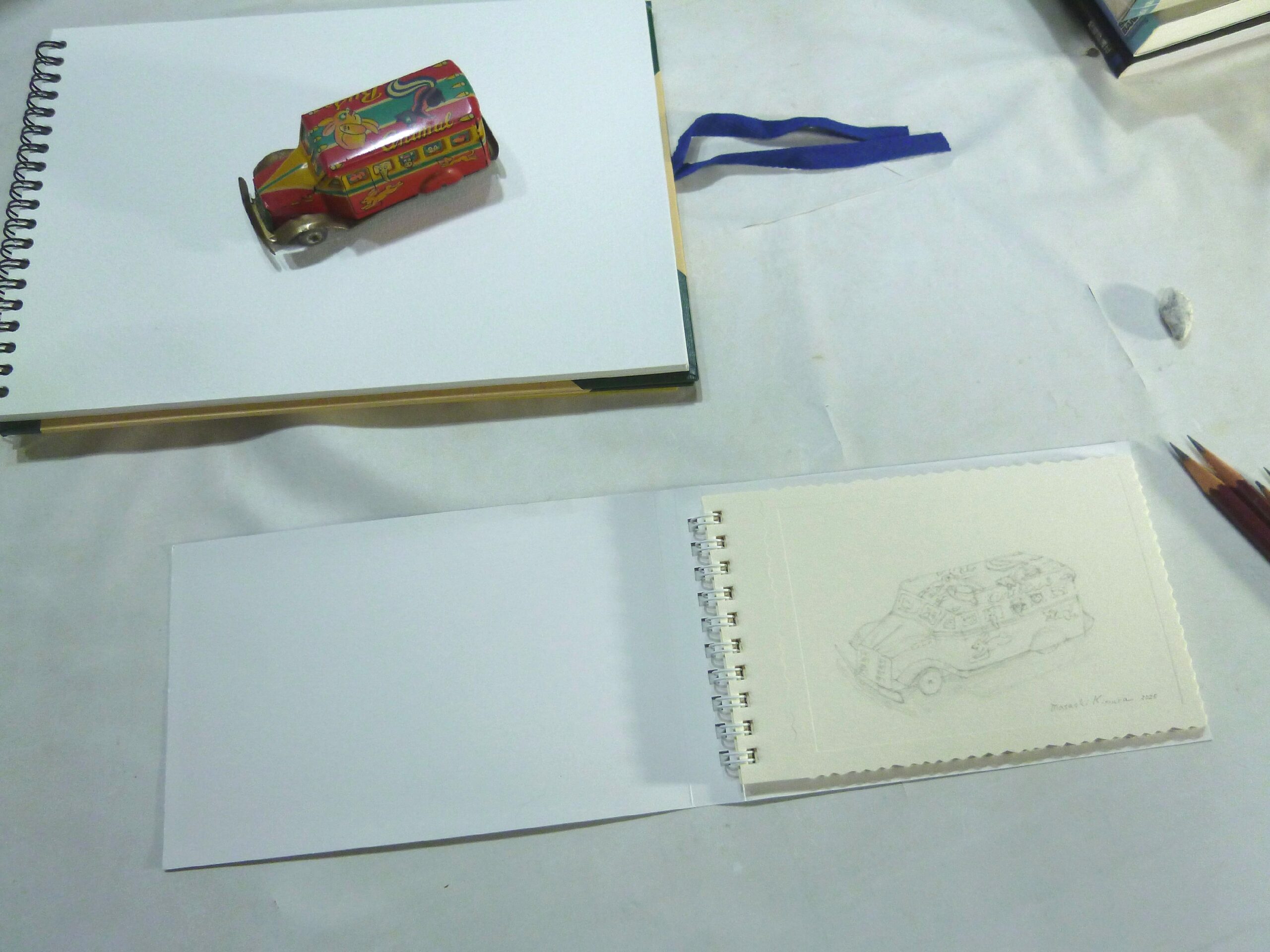 1950年代の長さ10cmほどの動物バスを描いてみました。F2のスケッチブックにすべきでしたが、途中で気が付きました。このポストカード紙は目が荒く、細かい描写には不向きでした。下は制作風景。