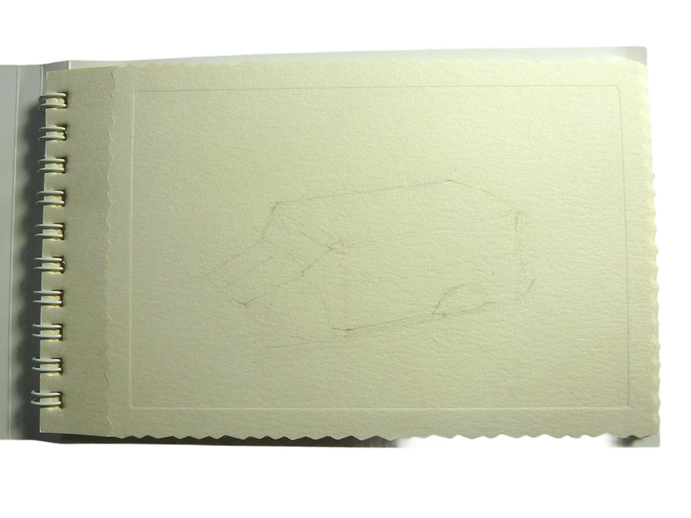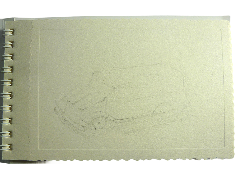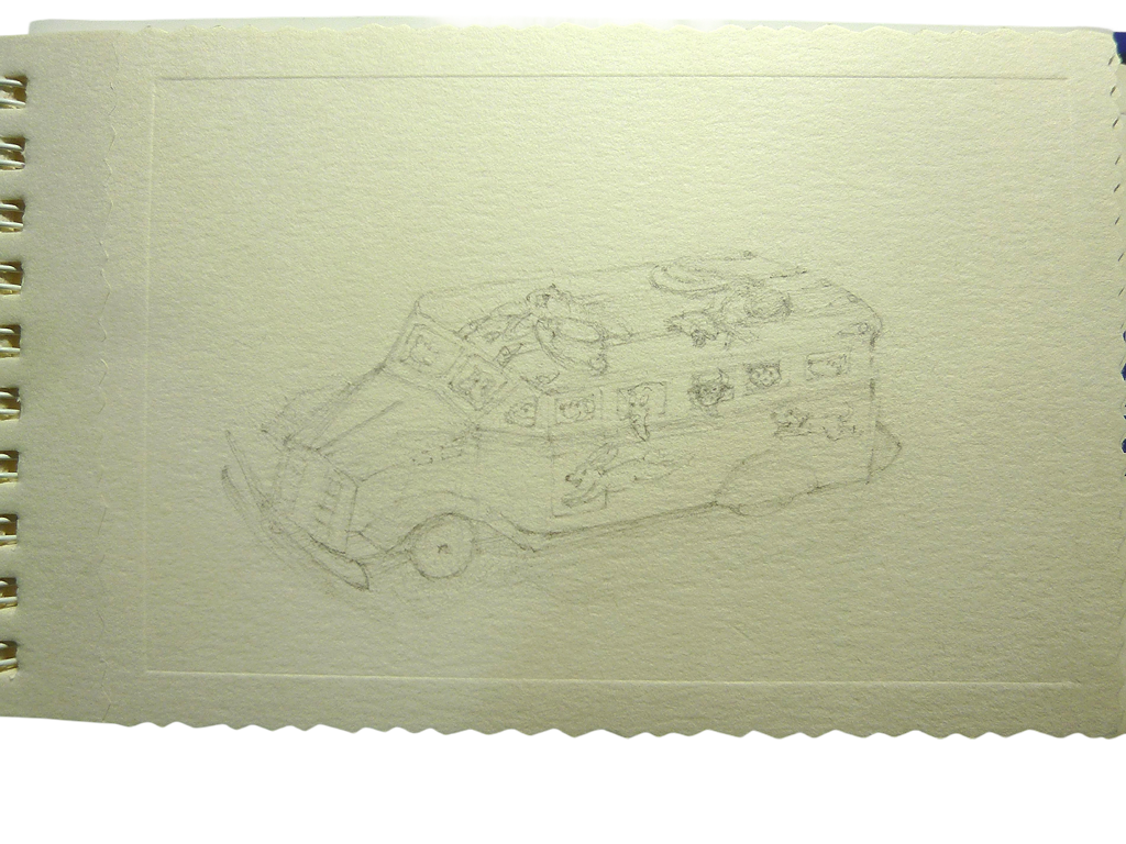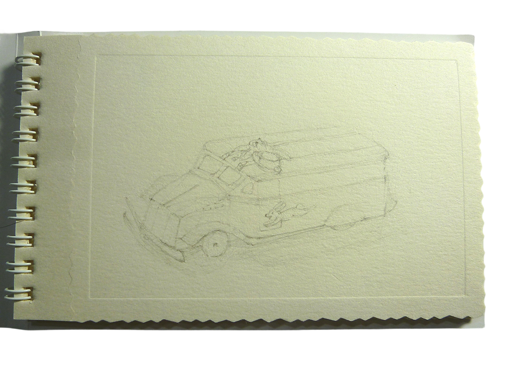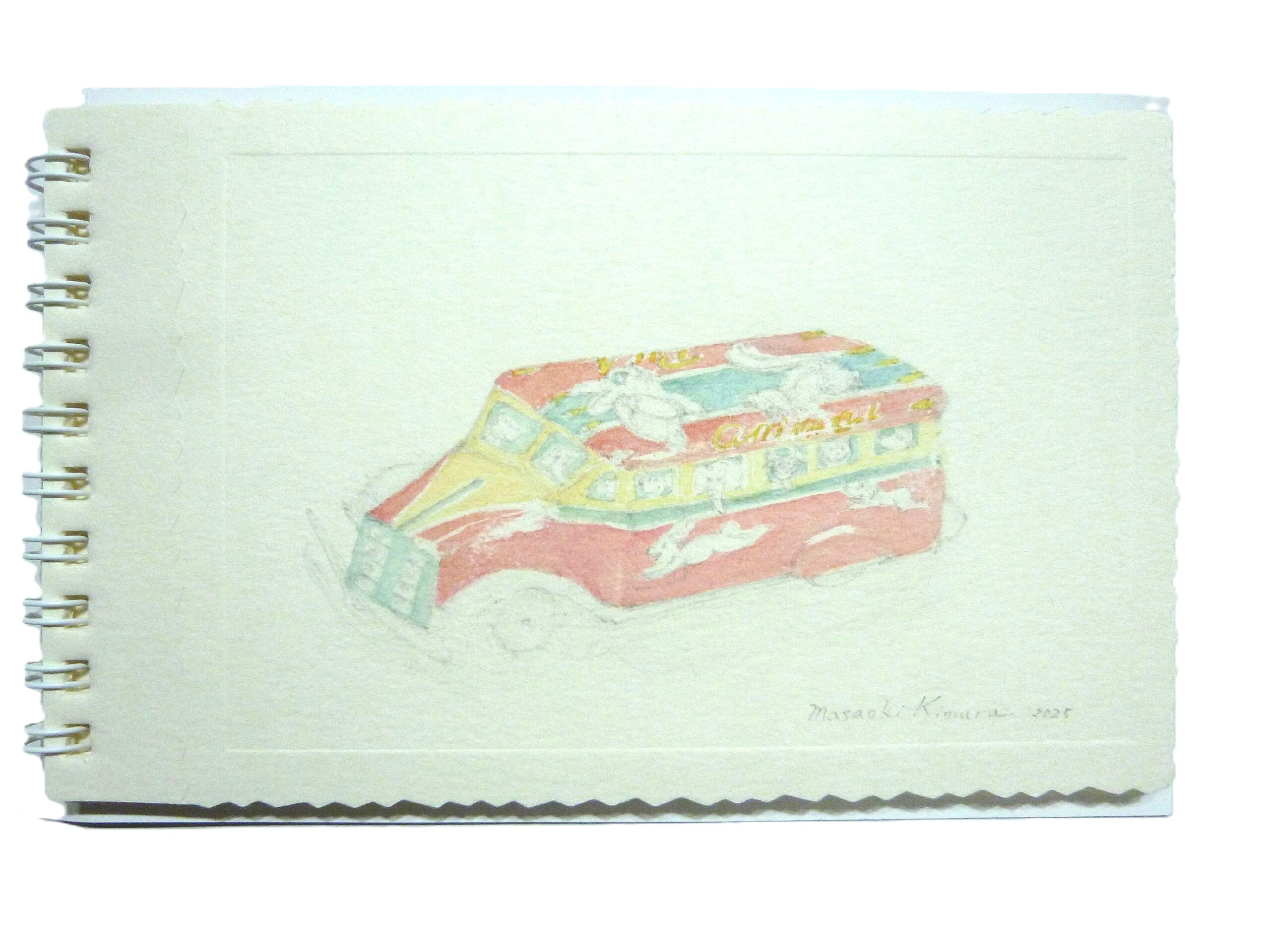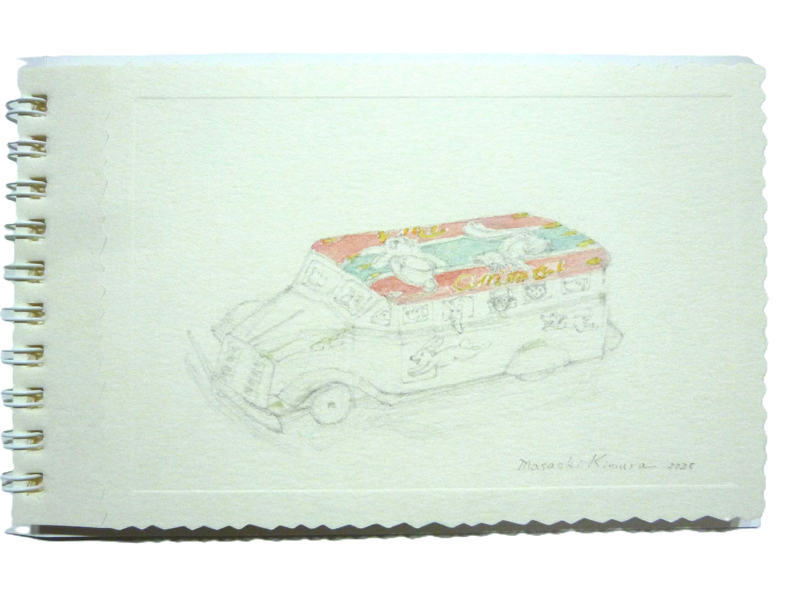 1950年代の長さ10cmほどの動物バスを描いてみました。F2のスケッチブックにすべきでしたが、途中で気が付きました。このポストカード紙は目が荒く、細かい描写には不向きでした。下は制作風景。