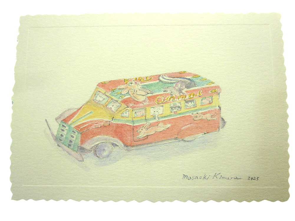 ブリキのおもちゃはどうしても細密な描写が不可欠ですし、また色がカラフルですので、風景を描くのとはかなり異なりますね。このブリキのバスのようにアトムなどのアニメのキャラクターが登場する前は、動物たちが万国共通のキャラクターでした。