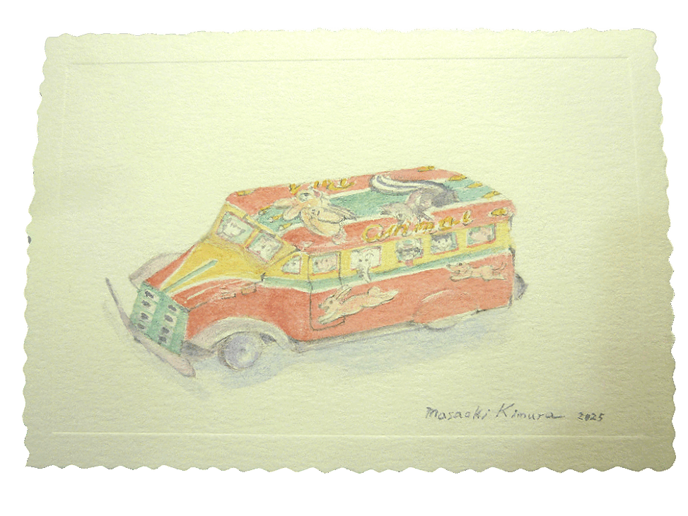ブリキのおもちゃはどうしても細密な描写が不可欠ですし、また色がカラフルですので、風景を描くのとはかなり異なりますね。このブリキのバスのようにアトムなどのアニメのキャラクターが登場する前は、動物たちが万国共通のキャラクターでした。