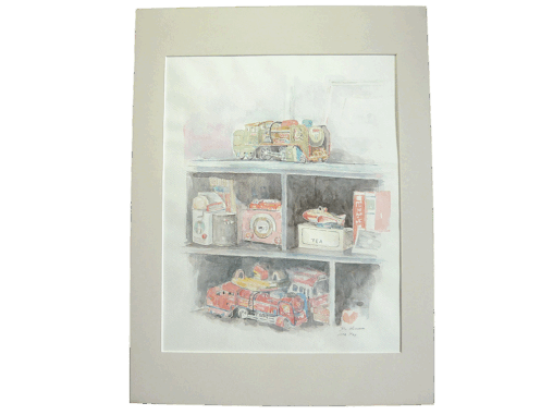 30年ほど前に描いた棚に並べたブリキのおもちゃです。大阪…