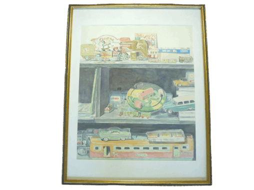 棚に置いていたブリキ玩具を20号の作品にしてみました。ワ…